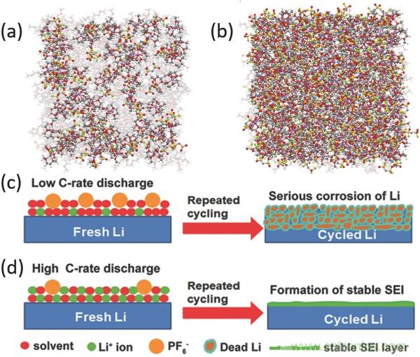 c-d)低速率高速率放電時,鋰金屬負極上的SEI演變。
