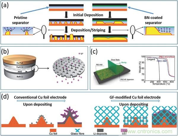 常規(guī)的非織造聚合物或微孔隔膜太脆弱以至于不能抵抗枝晶,對鋰沉積行為沒有顯著影響。這里開發(fā)了改進的中間層,以進一步保證電池的性能,這主要是通過與枝晶或鋰離子通量的相互作用。這里,中間層具有不同的功能,包括專門設計的分離器或附加的保護層,以彌補分離器的弱點。