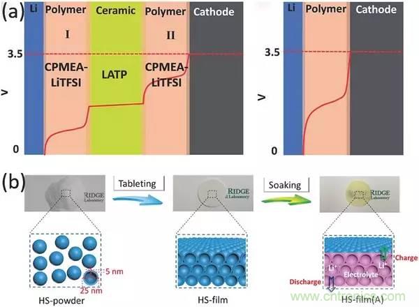 a)聚合物/陶瓷/聚合物-三明治電解質(左),內部曲線是固體混合電解質和單個固體聚合物電解質的電勢分布圖(右);