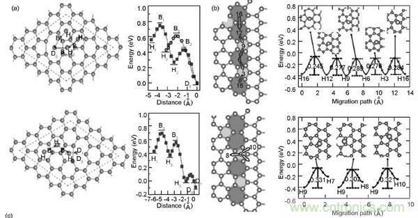 在鋰離子電池系統(tǒng)中,石墨烯除能夠存儲(chǔ)Li之外,還有一個(gè)重要的考察因素是石墨烯對(duì)Li離子擴(kuò)散過程的影響,這直接影響鋰離子電池的快速充放電行為。擴(kuò)散過程包括兩方面,Li在石墨烯表面上并以與表面平行的方向進(jìn)行擴(kuò)散,另外一種是穿過石墨烯平面,以與平面垂直的方向擴(kuò)散。
