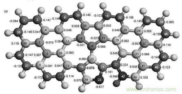 科學(xué)家使用團(tuán)簇結(jié)構(gòu)的石墨烯模型研究了含N石墨烯在酸性環(huán)境中對(duì)O2的催化機(jī)理。計(jì)算表明,OOH吸附在靠近吡啶結(jié)構(gòu)N的C原子上,其中一個(gè)O與C原子相互作用,并且該C原子從石墨烯平面伸出。對(duì)于吡咯N,OOH同樣會(huì)吸附在靠近N 的C原子上。當(dāng)在OOH上進(jìn)一步增加H后,吡啶N和吡咯N石墨烯上都會(huì)形成不穩(wěn)定的HOOH,O—O鍵長(zhǎng)增加,容易變成兩個(gè)OH,所以在N石墨烯上的ORR是四電子過程。同時(shí),作者提出自旋密度和電荷密度是決定催化效果的關(guān)鍵因素。盡管有的C電荷密度非常高,但是OOH更容易吸附在具有高自旋密度的C原子上。與電荷密度相比,自旋密度更能決定催化活性位,只有當(dāng)自旋密度非常小時(shí)電荷密度才起作用。圖9給出了所計(jì)算的摻N石墨烯上電荷密度和自旋密度分布。