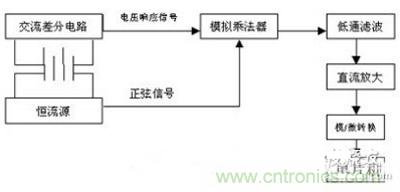 為了解決上述各方法的缺陷,本文采用了四端子測量方式,將蓄電池兩端上的電壓響應(yīng)信號通過交流差分電路與產(chǎn)生恒定交流源的正弦信號經(jīng)過模擬乘法器相乘,再將模擬乘法器的輸出電壓信號通過濾波電路,使交流信號轉(zhuǎn)變?yōu)橹绷餍盘?,直流信號?jīng)直流放大器放大后進行模數(shù)轉(zhuǎn)換,將轉(zhuǎn)換后的值送入單片機進行簡單處理。