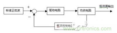 電路組成框圖如圖2所示:這是一個閉環(huán)控制系統(tǒng),電流負(fù)反饋電路。標(biāo)準(zhǔn)正弦波產(chǎn)生一個頻率穩(wěn)定、對稱、失真度低的1KHz正弦波信號。驅(qū)動電路把正弦波放大,去推動功放電路,得到正弦交流電流輸出。恒流控制電路從功放輸出中得到的信號,通過與給定的信號相比較,來調(diào)節(jié)驅(qū)動電路的信號,從而使輸出電流保持穩(wěn)定。