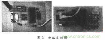 對(duì)應(yīng)于上述框圖的電路實(shí)物圖如圖2所示。其左右兩個(gè)電路分別對(duì)應(yīng)上述框圖中的左右兩個(gè)部分。總體來(lái)說(shuō),它包括電平轉(zhuǎn)換電路、單片機(jī)處理部分、無(wú)線(xiàn)收發(fā)部分(CCll00收發(fā)器 )、液晶顯示模塊和鍵盤(pán)輸入模塊五個(gè)部分。