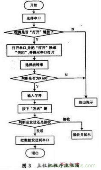 上位機(jī)程序可以用VB,VC++等語(yǔ)言來(lái)編程,但本方案采用比較方便的C#來(lái)編程實(shí)現(xiàn),其流程圖如圖3所示。