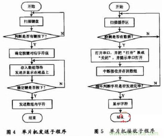 單片機(jī)程序主要包括主程序、單片機(jī)發(fā)送子程序、單片機(jī)接收子程序、液晶顯示子程序、鍵盤(pán)輸入子程序五部分,均采用C語(yǔ)言進(jìn)行模塊化編程。由于篇幅原因,下面只給出了單片機(jī)發(fā)送子程序和接收子程序,如圖4,圖5所示。