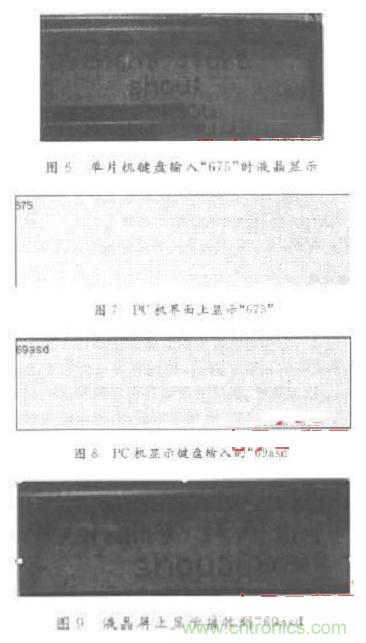 測(cè)試時(shí),連接好硬件打開(kāi)串行口COM1,并設(shè)波特率為9600b/s.單片機(jī)發(fā)送字符串“675”給PC機(jī),其液晶顯示如圖6所示,相應(yīng)的PC機(jī)界面顯示如圖7所示。PC機(jī)發(fā)送“69asd”給單片機(jī),液晶屏上即可接收到“69asd”,如圖8,圖9所示。測(cè)試結(jié)果說(shuō)明:基于串行口的PC機(jī)與單片機(jī)之間的雙工無(wú)線(xiàn)通信是切實(shí)可行的,而且無(wú)線(xiàn)傳輸?shù)木嚯x至少可達(dá)到100m.