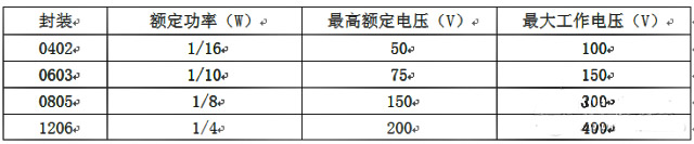 先來看看某廠家四種常用封裝電阻的參數(shù)表。其中表中有兩個(gè)值:額定工作電壓和最大工作電壓?!?