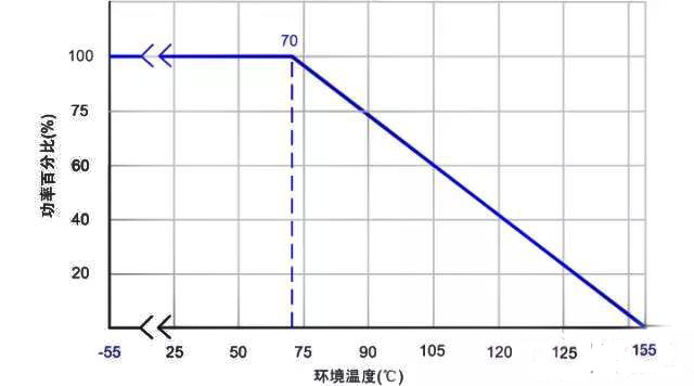 而最大工作電壓是在額定功率下,該電阻可以承受的最大電壓。但是要注意!看下面這個(gè)圖。可以看出額定功率是在最高環(huán)境溫度70度的條件下標(biāo)注的(不同廠家,系列可能有微小區(qū)別,在設(shè)計(jì)之初和問題查找的時(shí)候應(yīng)該核實(shí)清楚。)