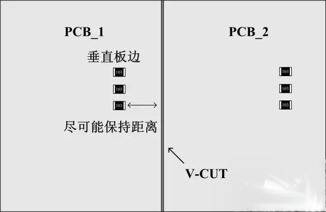 貼片電阻的另外一種常見的損壞是機(jī)械損傷后呈開路狀態(tài),后續(xù)導(dǎo)致電路異常(器件外觀有可能正常)。下面是幾個(gè)小建議:1、如果是手折板的話(極少使用,無法機(jī)器分析,毛刺大),貼片電阻長(zhǎng)度方向平行于PCB板邊,零件受的應(yīng)力??;如果是V-CUT的話,貼片器件長(zhǎng)度方向垂直于PCB邊,零件破裂可能性較小。2、元件如果與連接處垂直,到連接處的距離建議要≥4mm,若平行,距離建議要≥1.5mm.3、在成本允許的情況下,適當(dāng)加厚PCB板厚度,特別是面積比較大的板子。(下面是兩個(gè)簡(jiǎn)單的示意圖,實(shí)際情況請(qǐng)實(shí)際分。)