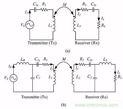 圖1:無線輸電(WPT)設(shè)計中所用補償電路拓?fù)溆兴姆N,這里是其中兩種:(a)SS拓?fù)?,(b)LCL-LCL拓?fù)洹?/p>