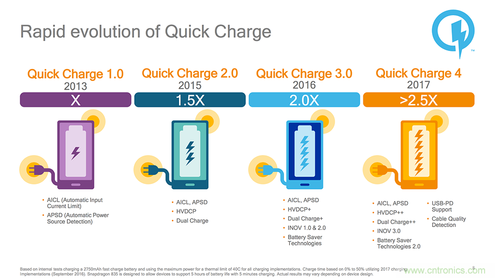經(jīng)過(guò)不斷地改進(jìn),高通的 Quick Charge 2.0/3.0 可以實(shí)現(xiàn)“9V 2A”,也就是以最高 18W 的功率進(jìn)行充電。