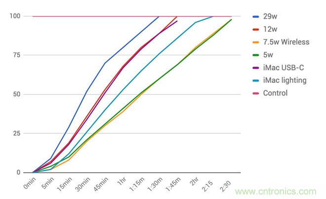 如果選購(gòu) 149 元的 12W 的充電器,雖然輸入功率上不如 29W,但已經(jīng)比 5W 的慢充頭快得多了。根據(jù) AppleInsider 的測(cè)試,給 iPhone 8 Plus 充滿電,12W 充電器雖然比 29W 的慢了約 20 分鐘,卻足足比 5W 慢充頭快了一個(gè)小時(shí)。