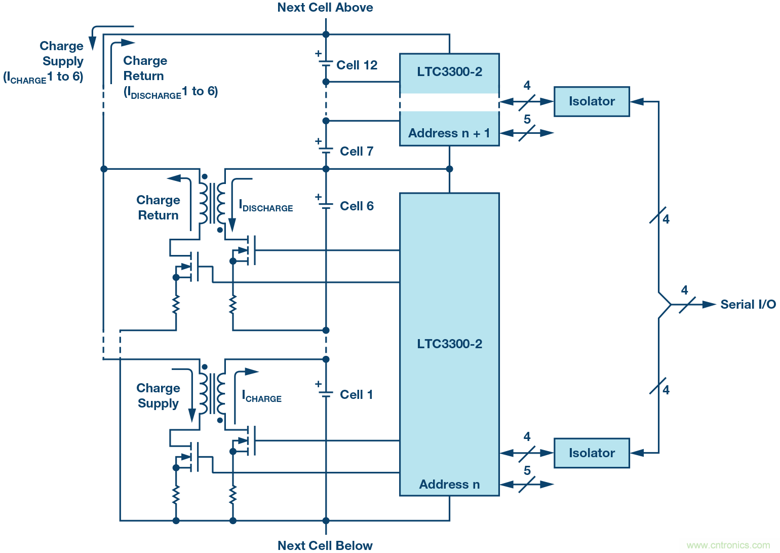 圖4. LTC3300-2高效率、雙向、多電池單元主動(dòng)均衡器。