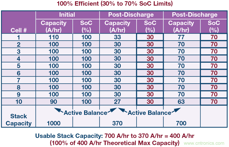 圖3顯示了使用理想主動(dòng)均衡功能可以100%恢復(fù)因電池單元間不匹配而導(dǎo)致的容量損失。在穩(wěn)態(tài)使用期間,當(dāng)電池包從70% SoC 的完全充電狀態(tài)放電時(shí),必須從第1個(gè)單元(最高容量電池單元)中取出存儲(chǔ)的電荷并轉(zhuǎn)移到第10個(gè)單元(最低容量電池單元),否則第10個(gè)單元會(huì)先于其他單元達(dá)到最小30%的SoC點(diǎn),導(dǎo)致電池包必須停止放電以防壽命進(jìn)一步縮短。類似地,在充電階段必須將電荷從第10個(gè)單元中移除,重新分配到第1個(gè)單元,否則第10個(gè)單元會(huì)率先達(dá)到70%的SoC上限,導(dǎo)致充電周期必須停止。在電池包使用壽命中的某個(gè)時(shí)間點(diǎn),電池單元老化的差異將不可避免地造成電池單元之間的容量不匹配。只有主動(dòng)均衡解決方案才能恢復(fù)容量,根據(jù)需要將電荷從高SoC單元重新分配給低SoC單元。為在電池包使用壽命期間實(shí)現(xiàn)最大容量,需要通過主動(dòng)均衡解決方案來給單個(gè)電池單元有效充電和放電,以使整個(gè)電池包維持SoC均衡。