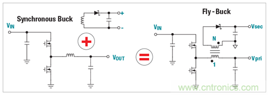 圖1:Fly-Buck轉(zhuǎn)換器創(chuàng)建方式是在一個(gè)同步降壓轉(zhuǎn)換器內(nèi)添加耦合繞組。
