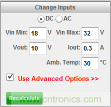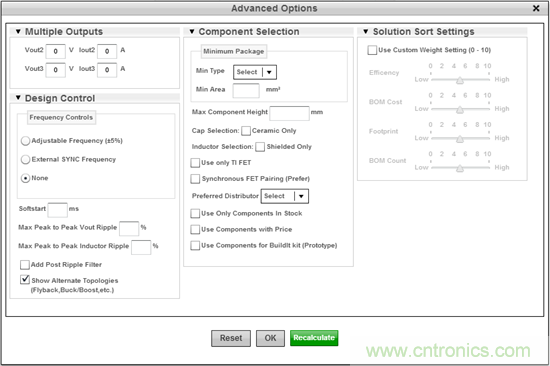 單擊“Use Advanced Options”(使用高級(jí)選項(xiàng))來打開Advanced Options菜單(圖3)。在Design Control(設(shè)計(jì)控制)項(xiàng)下,確保“Show Alternate Topologies”(顯示替代拓?fù)洌?fù)選框被選中,這樣將列出所有可能的Fly-Buck解決方案。在你確認(rèn)復(fù)選框的選擇后,單擊“Recalculate”(重新計(jì)算)按鈕來繼續(xù)。