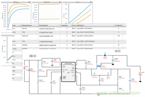 圖5:WEBENCH工具提供針對(duì)你Fly-Buck設(shè)計(jì)的一個(gè)功率耗散值列表,一個(gè)完整的BOM和一個(gè)電路原理圖。