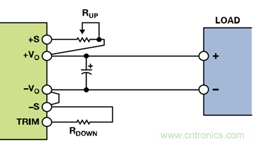 輸出電壓可通過改變連接電源模塊正輸出端或接地端的電阻來進(jìn)行調(diào)節(jié)。通過連接外部電阻RUP并使RDOWN浮空,可以向上調(diào)整輸出電壓(高于標(biāo)稱輸出電壓),或者通過連接外部電阻RDOWN并使RUP短路(電阻值為零)向下調(diào)整(低于標(biāo)稱輸出電壓)。