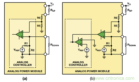 圖2. 利用 (a) 帶有可配置內(nèi)部基準(zhǔn)電壓的模擬控制器,或者(b) 帶有固定內(nèi)部基準(zhǔn)電壓的模擬控制器調(diào)整模擬電源模塊的輸出電壓