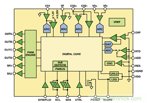 對(duì)于數(shù)字控制器來說,所有的控制功能均由數(shù)字邏輯實(shí)現(xiàn)。圖3所示為集成PMBus接口的高級(jí)數(shù)字控制器ADP1051的功能框圖。該器件非常適合高密度DC-DC電源轉(zhuǎn)換,具有6個(gè)可編程脈沖寬度調(diào)制 (PWM) 輸出,可控制大部分高效電源拓?fù)?。另外,該器件還能控制同步整流 (SR),并集成6個(gè)模數(shù)轉(zhuǎn)換器 (ADC),能夠采樣模擬輸入電壓、輸入電流、輸出電壓、輸出電流、溫度以及其它參數(shù)。轉(zhuǎn)換為數(shù)據(jù)后,將這些信號(hào)發(fā)送至數(shù)字內(nèi)核模塊進(jìn)行處理。該器件采用靈活的狀態(tài)機(jī)架構(gòu),以硬件實(shí)現(xiàn)全部功能,提供穩(wěn)定可靠的解決方案,但無法通過編程實(shí)現(xiàn)設(shè)計(jì)以外的功能。器件的全部功能—包括輸出電壓調(diào)整—均以數(shù)字方式處理。為了調(diào)整輸出電壓,應(yīng)通過PMBus接口發(fā)送一條命令,改變數(shù)字基準(zhǔn)電壓值。