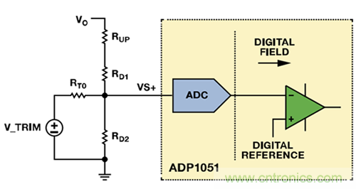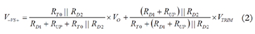 VS+引腳上的正常工作電壓為1 V。若VTRIM為1 V左右且RT0遠(yuǎn)大于RD2,則可忽略電路的其余分支部分。復(fù)合網(wǎng)絡(luò)用作簡(jiǎn)單分壓器,并調(diào)節(jié)RUP電阻值,提供類似于模擬控制器的特性,實(shí)現(xiàn)了模擬電源模塊中的電壓向上調(diào)整。