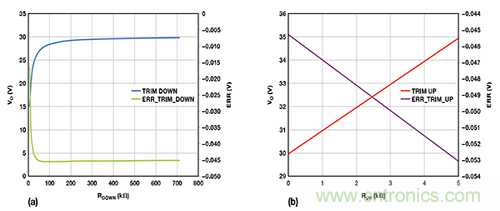 圖6. 使用重新配置的反饋網(wǎng)絡(luò)后,調(diào)整ADP1051輸出電壓的計(jì)算結(jié)果:(a) 向下調(diào)整 (b) 向上調(diào)整
