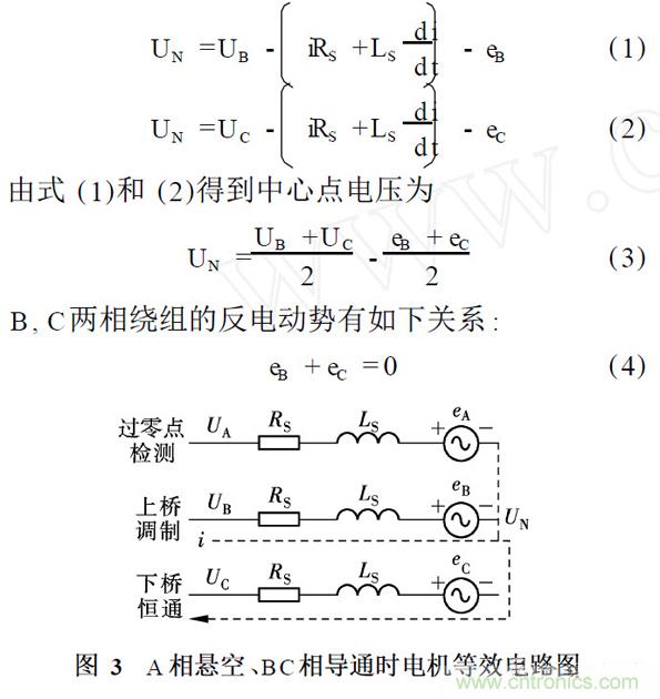 提出了在on _pwm 調(diào)制方式時的反電動勢過零點檢測方法,采用內(nèi)置AD 的微控制器在PWM開通時檢測懸空相端電壓,軟件算法中使用簡單的代數(shù)運算,獲得準(zhǔn)確的過零點信號. 目前,關(guān)于反電動勢法的研究多集中在反電動勢過零點的檢測電路方法和由濾液電路引起的相位誤差的消除或補償方法,但在準(zhǔn)確換相方面的研究尚不夠深入.
