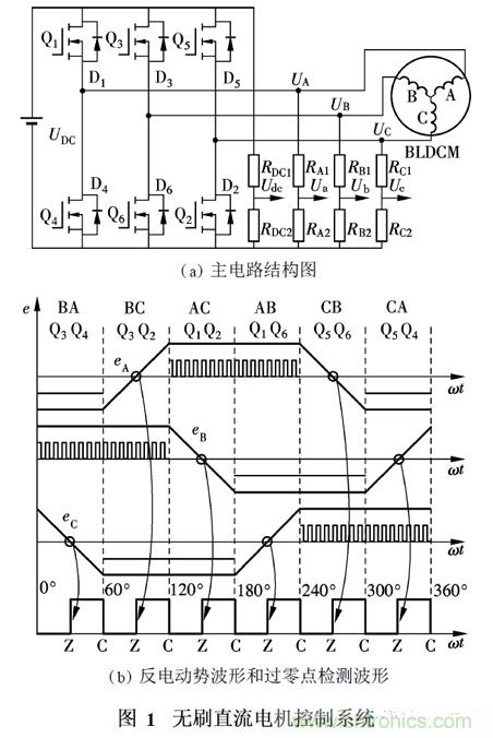 本文采用基于端電壓的直接反電動勢檢測電路,通過檢測懸空相繞組的端電壓信號來獲得反電動勢過零點. 采用分壓電阻對端電壓和直流側(cè)電壓進行同比例分壓,使分壓后的被測信號落在采樣單元允許的輸入范圍內(nèi). 圖1 ( a)為主電路和直接反電勢法分壓電路,端電壓UA , UB , UC 和UDC經(jīng)過分壓后分別為Ua , Ub , Uc 和Udc.