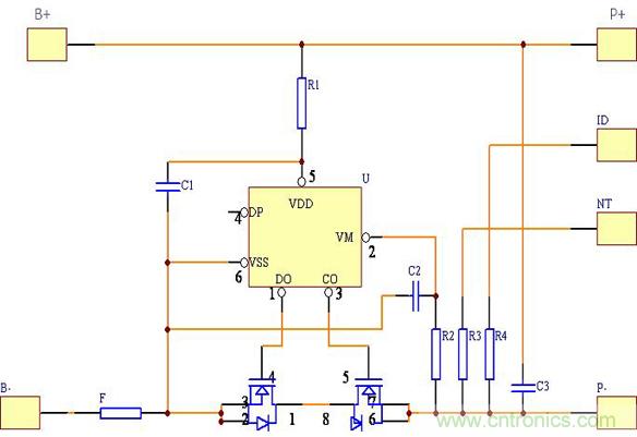 該保護回路由兩個MOSFET(T1、T2)和一個控制IC(N1)外加一些阻容元件構(gòu)成。控制IC負(fù)責(zé)監(jiān)測電池電壓與回路電流,并控制兩個MOSFET的柵極,MOSFET在電路中起開關(guān)作用,分別控