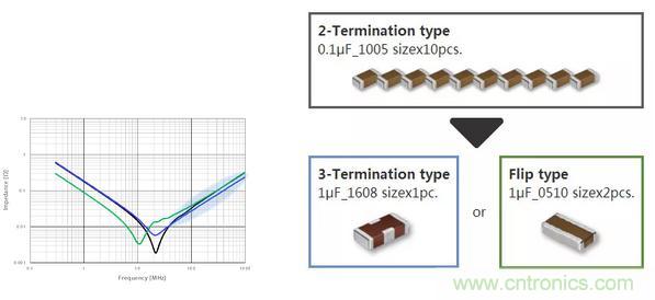 為了抑制電壓波動,需要降低阻抗。此處將介紹為了在基板尺寸以及貼裝區(qū)域等受到嚴(yán)格限制的情況下實(shí)現(xiàn)所需要的阻抗特性,TDK所提出的通過替換為低ESL產(chǎn)品來減少去耦電容數(shù)量的方案。