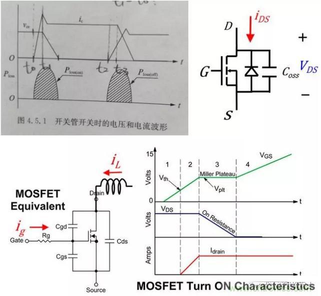 這里就用MOSFET代替BJT了,所以ids = ic,Vds=Vce,Coss也就是Cds代表輸出電容。簡(jiǎn)單來(lái)說(shuō)就是當(dāng)MOS管一開(kāi)始導(dǎo)通時(shí)輸出電容Coss還保持Vds電壓,隨著Ids電流越來(lái)越大,Vds電壓終于保持不住,開(kāi)始下降。直到管子完全開(kāi)啟。比較詳細(xì)的開(kāi)啟過(guò)程是由Miller Plateau造成的,這里借用了網(wǎng)上一些解釋Miller Plateau的圖,如果有不清楚的就請(qǐng)見(jiàn)諒了。