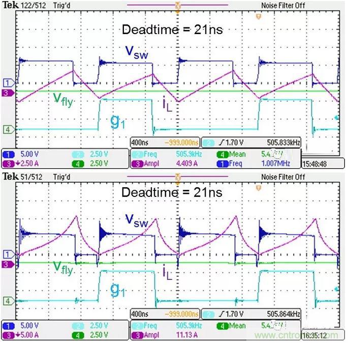 對(duì)于half bridge 實(shí)現(xiàn)ZVS turn on,我們希望當(dāng)上管Q1開(kāi)啟時(shí)電流是流進(jìn)switching node (vsw)的,也就是圖中電感電流為負(fù)值,當(dāng)下管Q2開(kāi)啟時(shí)我們希望電流是流出switching node (vsw)的,也就是電感電流為正值。為什么這樣就可以實(shí)現(xiàn)ZVS turn on了呢?我們就看上管Q1開(kāi)啟過(guò)程。如果電感電流iL為負(fù),這時(shí)候我們先關(guān)閉Q2,這時(shí)候Q1還未開(kāi)啟,在這個(gè)deadtime中iL會(huì)charge Q2的Coss,使Vsw抬高到Vin,當(dāng)然不能超過(guò)Vin,因?yàn)镼1的body diode會(huì)導(dǎo)通,鉗位住Vsw到Vin,這時(shí)候Q1的Vds就是Vin-Vsw=0,這時(shí)候我們開(kāi)啟Q1就實(shí)現(xiàn)ZVS了。同理對(duì)于Q2開(kāi)啟時(shí),如果電感電流為正,那么當(dāng)我們首先關(guān)閉Q1管時(shí),Vsw就會(huì)被電感電流拉低到0,因?yàn)閕L》0, Q2的Coss會(huì)discharged到0,然后我們?cè)匍_(kāi)啟Q2,就可以達(dá)到ZVS了。這里我有一張其他Topology的PWM converter的波形圖,也和buck工作原理類似,大概可以看看基本原理,也就是電感電流為負(fù)時(shí),Q1可以實(shí)現(xiàn)ZVS,讓Vsw的ringing比較小。而當(dāng)電感電流為正時(shí),實(shí)現(xiàn)不了ZVS,Vsw的ringing就比較大了。