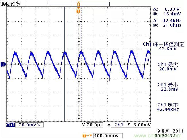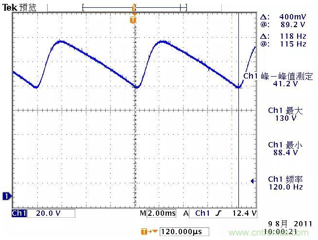 低頻紋波是與輸出電路的濾波電容容量相關(guān)。由于開關(guān)電源體積的限制,電解電容的容量不可能無限制地增加,導(dǎo)致輸出低頻紋波的殘留,該輸出紋波頻率隨整流電路方式的不同而不同。