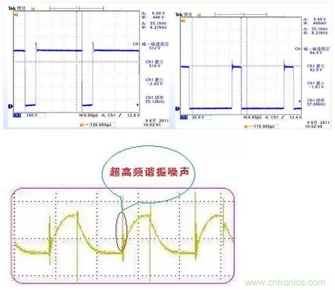 超高頻諧振噪聲主要來源于高頻整流二極管反向恢復(fù)時(shí)二極管結(jié)電容、功率器件開關(guān)時(shí)功率器件結(jié)電容與線路寄生電感的諧振,頻率一般為1~10MHz,通過選用軟恢復(fù)特性二極管、結(jié)電容小的開關(guān)管和減少布線長度等措施可以減少超高頻諧振噪聲。