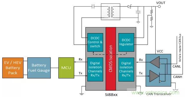 如圖3所示,這個(gè)簡(jiǎn)化的BMS系統(tǒng)展示了在與一個(gè)EV子系統(tǒng)進(jìn)行連接時(shí)信號(hào)和電源隔離的重要性。在大多數(shù)EV子系統(tǒng)中,CAN總線通過(guò)數(shù)字隔離與該子系統(tǒng)中的高壓隔離?,F(xiàn)代數(shù)字隔離兩側(cè)各需要一個(gè)電源為隔離器供電(高壓域和低壓域)。該電源也可為連接到隔離器的其他設(shè)備供電,例如CAN總線收發(fā)器。