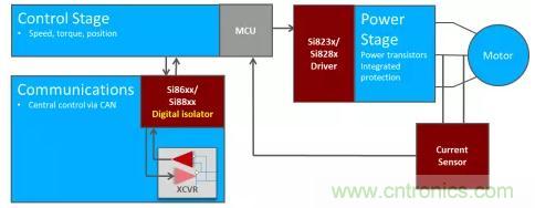 這些系統(tǒng)需要在馬達(dá)控制器和功率晶體管之間采用隔離驅(qū)動(dòng)器。隔離允許低壓控制器安全地開關(guān)高功率晶體管以產(chǎn)生交流波形。此外,馬達(dá)控制系統(tǒng)中可能存在隔離的CAN總線,并且有某些方法可以感測(cè)驅(qū)動(dòng)馬達(dá)的電流,以監(jiān)控速度和轉(zhuǎn)矩。圖4展示了一個(gè)使用一系列數(shù)字隔離設(shè)備的簡(jiǎn)化的牽引馬達(dá)控制系統(tǒng)。