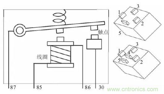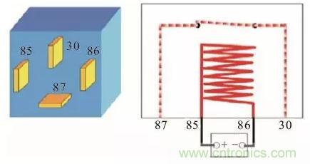 如下圖所示,85#和86#端子是線圈,屬于控制部分;87#和30#端子是觸點(diǎn),屬于被控制部分(即輸出端)。