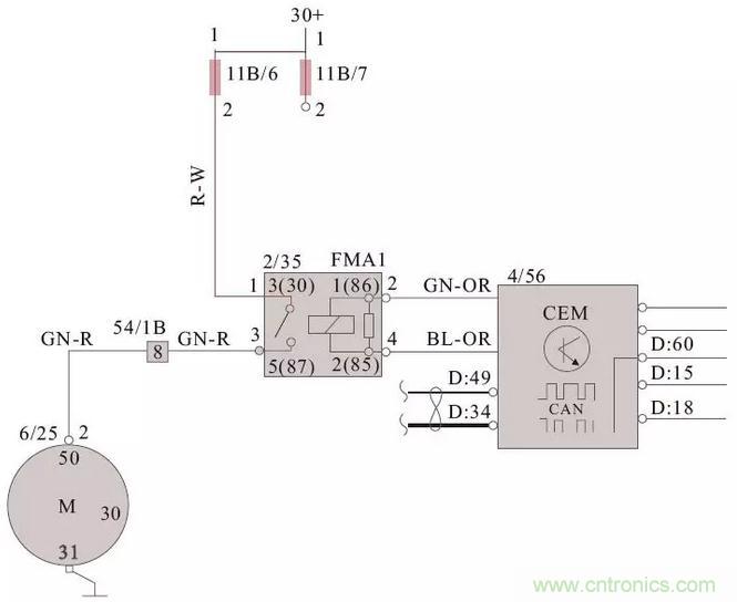 繼電器在汽車電路中的應(yīng)用非常廣泛。如啟動(dòng)系統(tǒng)電路、雨刮器電路、后窗加熱電路等。車輛啟動(dòng)時(shí)需要大的啟動(dòng)電流,如果使用點(diǎn)火開關(guān)直接控制大電流經(jīng)過的點(diǎn)火開關(guān),啟動(dòng)觸點(diǎn)會(huì)出現(xiàn)觸點(diǎn)打火、燒蝕等現(xiàn)象,影響點(diǎn)火開關(guān)使用壽命甚至?xí)斐删€路燒蝕、起火等嚴(yán)重后果。使用繼電器以小電流控制大電流則不會(huì)出現(xiàn)以上問題。