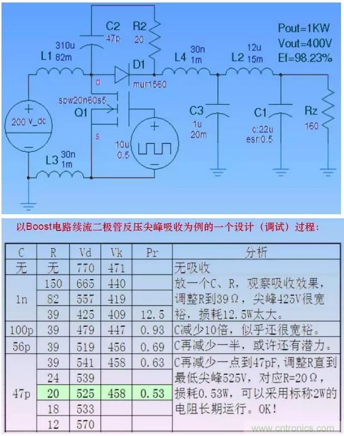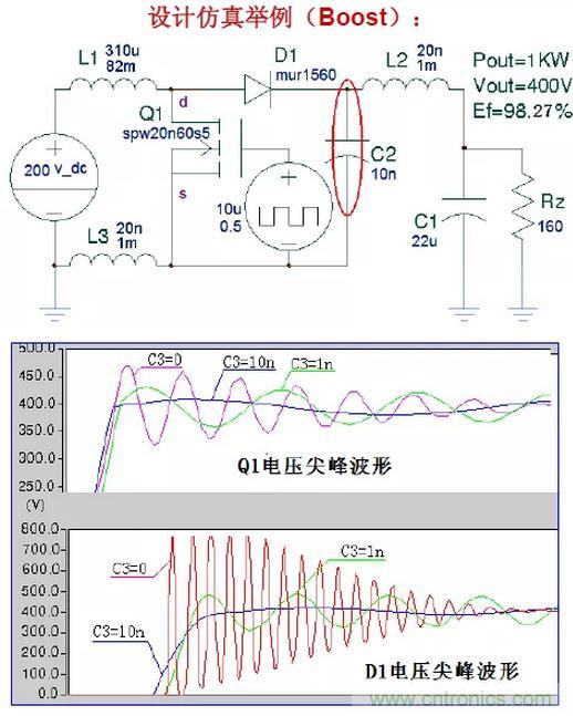 將開關(guān)管Q1、拓?fù)淅m(xù)流二極管D1和一個無損的拓?fù)潆娙軨2組成一個在布線上盡可能簡短的吸收回路。