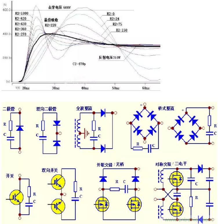 對應(yīng)一個特定的吸收環(huán)境和一個特定大小的電容C,有一個最合適大小的電阻R,形成最大的阻尼、獲得最低的電壓尖峰。