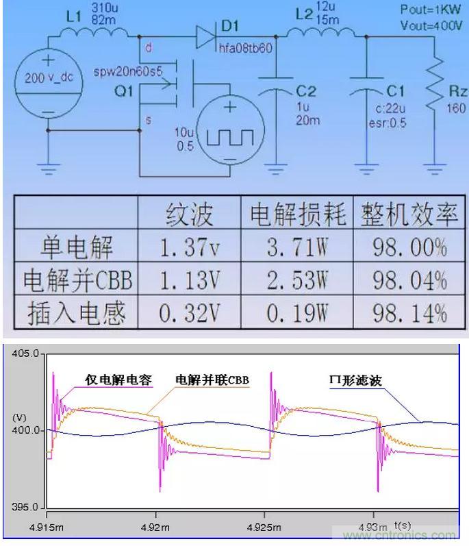 提出的辦法是:用電感將電解和CBB分開,CBB位于高頻紋波電流側(cè),電解位于直流(工頻)側(cè),各自承擔(dān)對應(yīng)的濾波任務(wù)。
