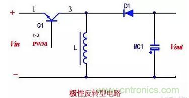 如下圖為極性反轉型電路,也叫倒置型電路。當Q1導通時,uin加在l兩端,產(chǎn)生電流和儲存能量。Q1截止后,l上的電流經(jīng)二極管D1給電容器MC1充電。由此產(chǎn)生與輸人電壓極性相反的輸出電壓。