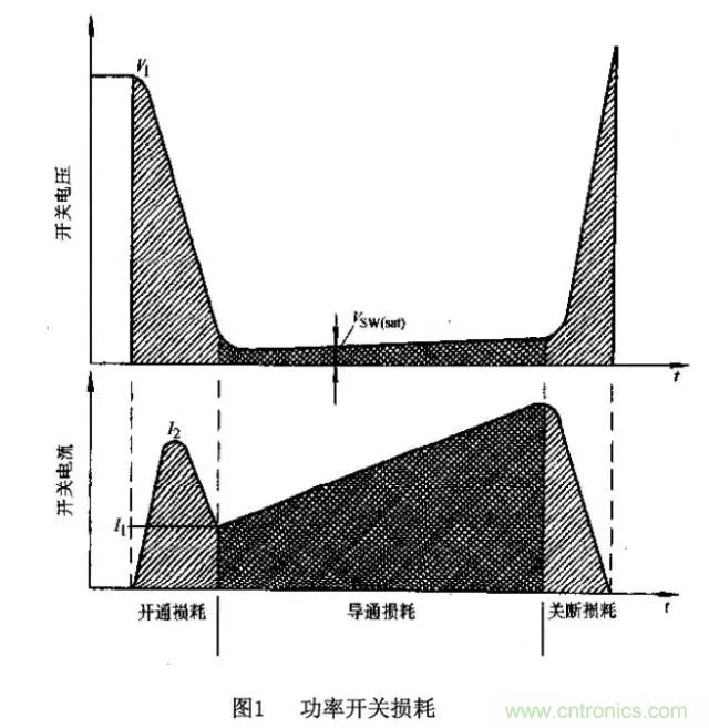 功率開關(guān)是典型的開關(guān)電源內(nèi)部最主要的兩個損耗源之一。損耗基本上可分為兩部分:導(dǎo)通損耗和開關(guān)損耗。導(dǎo)通損耗是當(dāng)功率器件已被開通,且驅(qū)動和開關(guān)波形已經(jīng)穩(wěn)定以后,功率開關(guān)處于導(dǎo)通狀態(tài)時的損耗;開關(guān)損耗是出現(xiàn)在功率開關(guān)被驅(qū)動,進(jìn)入一個新的工作狀態(tài),驅(qū)動和開關(guān)波形處于過渡過程時的損耗。這些階段和它們的波形見圖1。