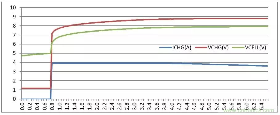 基于這個管理過程,使用充電芯片BQ24725A對一塊對講機電池(滿充電壓8.8V)進(jìn)行充電,并記錄下充電過程中的VCHG, ICHG和VCELL(電芯側(cè)的電壓)。下圖所示為基于橫坐標(biāo)的充電時間(分鐘)對應(yīng)的各個參數(shù)的變化趨勢,可以看到在不到第五分鐘,VCHG就達(dá)到最大值,ICHG就從峰值的4A電流開始下降,經(jīng)歷了從CC區(qū)間到CV區(qū)間的切換。最大充電速率的CC階段4A充電持續(xù)時間很短,可以預(yù)料,如果要對這塊電池完全充滿,CV區(qū)間將耗費很長的時間。