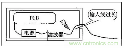 許多設(shè)備的電源線進入機箱后,經(jīng)過很長的導(dǎo)線才接到濾波器的輸入端。例如,電源線從機箱后面板輸入,走行到前面板的電源開關(guān),又回到后面板接到濾波器。或者濾波器的安裝位置距離電源線入口較遠,造成引線太長(如圖1所示)。
