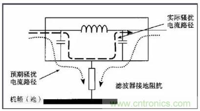 許多設(shè)備的電源線進(jìn)入機(jī)箱后,經(jīng)過很長的導(dǎo)線才接到濾波器的輸入端。例如,電源線從機(jī)箱后面板輸入,走行到前面板的電源開關(guān),又回到后面板接到濾波器?;蛘邽V波器的安裝位置距離電源線入口較遠(yuǎn),造成引線太長(如圖1所示)。