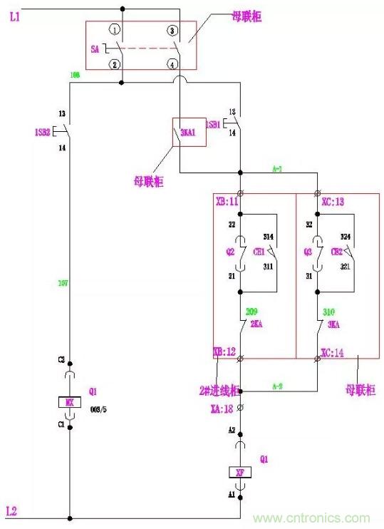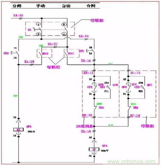 手動時(shí):萬轉(zhuǎn)SA的1、2腳連通。當(dāng)Q2、Q3合閘,Q1合閘回路A-2、A-3斷開,其合閘線圈XF無法得電, Q1不能滿足合閘條件;同理,當(dāng)Q1、Q2或Q1、Q3同時(shí)合閘時(shí),Q2或Q3也同樣不能滿足合閘條件。使進(jìn)線柜與母聯(lián)滿足“三合二”邏輯。