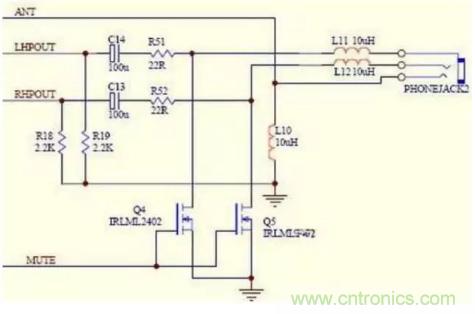 上圖是一個(gè)有主控控制耳機(jī)有沒有聲音輸出的電路圖,聲音的左右聲道分別通過隔直流電容C13、C14和電阻R51、R52送到耳機(jī)孔,但是在電阻R51、R52和耳機(jī)孔之間卻接入了一個(gè)N溝道的mos場效應(yīng)管,這個(gè)場效應(yīng)管的柵極連接在一起受著MUTE的控制,當(dāng)MUTE的地方處于高電位時(shí)候,Q4、Q5導(dǎo)通,就會(huì)把聲音通過Q4、Q5入地,耳機(jī)里就不會(huì)有聲音了,當(dāng)MUTE的地方處于低電位時(shí)候,Q4、Q5關(guān)斷,聲音就只有通過耳機(jī)而發(fā)出聲音了!