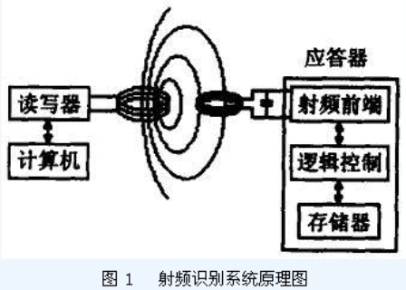 通常情況下, RFID 的應(yīng)用系統(tǒng)主要由讀寫器和RFID 卡兩部分組成的,如圖1 所示. 其中,讀寫器一般作為計(jì)算機(jī)終端,用來實(shí)現(xiàn)對RFID 卡的數(shù)據(jù)讀寫和存儲,它是由控制單元、高頻通訊模塊和天線組成.而RFID 卡則是一種無源的應(yīng)答器,主要是由一塊集成電路( IC) 芯片及其外接天線組成,其中RFID 芯片通常集成有射頻前端、邏輯控制、存儲器等電路 ,有的甚至將天線一起集成在同一芯片上 .